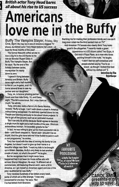 News of the World, tabloid, U.K. Americans love me in the Buffy. British actor Tony Head bares all about his rise to US success, January 30, 2000, by Tim Oglethorpe. [Inset quote:] My Favourite Programme...is Buffy the Vampire Slayer, of course! We have parties in LA where we all watch it." Buffy The Vampire Slayer, Friday, Sky One, 8pm. He may be in one of America's biggest TV shows, but British actor Tony Head reckons he's skint - at least for three months of the year! The former Nescafe coffee ad star is now a big hit in the US thanks to his role as librarian Rupert Giles in Buffy the Vampire Slayer. But he says, "By the end of the holiday between series, moneywise I'm nearly down to zero. "I spend it flying between America and Britain. Buffy takes eight and a half months to film in Los Angeles, and I fly home several times to see my partner and our daughters." Tony, 44, is forever phoning partner Sarah and their kids Emily, 10, and Daisy, eight. "The bill is enormous. But I miss them so much," he admits. Tony, who also rents a flat in LA's Santa Monica, reveals: "Buffy is huge. I can't walk down a street in America without being recognised. It's definitely opened doors for me. People are listening seriously to me about future projects I'd like to get off the ground, such as an animated musical. "But I can only do this because Sarah agrees to become a single mum for eight and a half months of the year. She is an extraordinary woman. I'm incredibly grateful to her." In fact, he was willing to give up his most successful role to date--until Sarah stepped in. "Sarah said I shouldn't be so stupid. And the girls have told me I'd be foolish to jack in such a cool programme," he smiles. Tony has toyed with the idea of moving his family to Los Angeles, but doesn't want to give up their home in a beautiful village near Bath."I want my kids to be brought up in Britain. Besides, Buffy's only likely to last another couple of years, so what's the point?" he laughs. But he recognizes that it might never have happened had it not been for those coffee ads with actress Sharon Maughan. He says, "A different set of commercials, still featuring Sharon and I, were a hit in America, so I got myself an American agent and one of the jobs I auditioned for was Buffy. Tony receives hundreds of fan letters every week, some of which are a little strange."I was very concerned for one boy," he says. "But I've had letters from librarians, thanking me for making their profession trendy and one sci-fi mag even voted me the third sexiest man on TV!" And American TV bosses also clearly think Tony looks good in the altogether. "I recently made a guest appearance in a US sitcom called Two Guys, A Girl And A Pizza Place, as a man who loves painting himself in the nude," he laughs. I didn't feel too self-conscious until people started saying 'You're so brave', as though I looked that bad without my clothes on!"